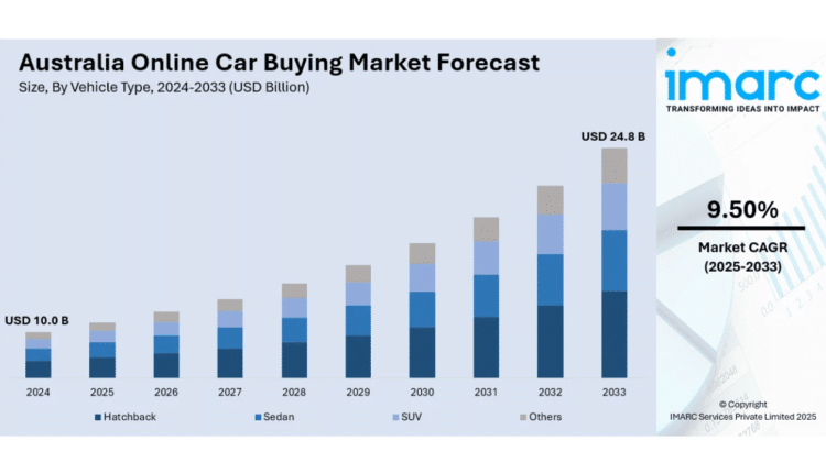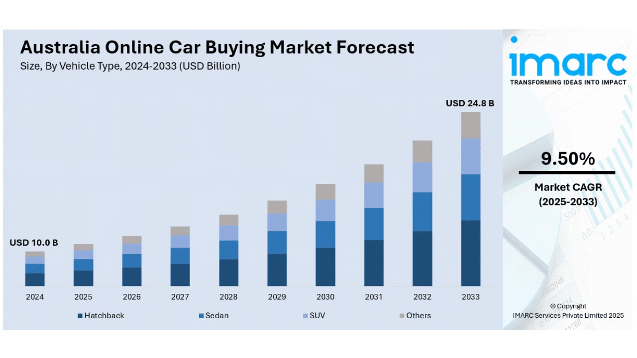 The Australia online car buying market size was USD 10.0 Billion in 2024 and is projected to reach USD 24.8 Billion by 2033, with a CAGR of 9.50% during 2025-2033. Growth is driven by increasing digital adoption, convenience demand, and contactless payments. Innovations like virtual showrooms, digital financing, and enhanced consumer confidence in secure online platforms are significantly contributing to this expansion.